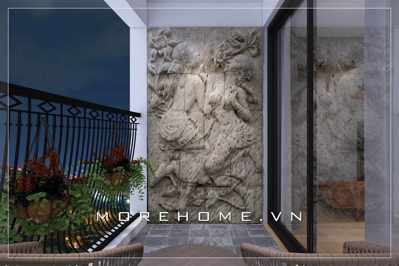 Ban công biệt thự tân cổ điển được trang trí bằng song sắt cao cấp kết hợp với chậu cây và bức tường đá điêu khắc độc đáo, tạo nên một không gian thư giãn và tôn lên vẻ đẹp của căn nhà.