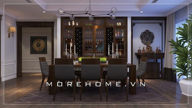 Người ta được chiêm ngưỡng mẫu thiết kế nội thất chung cư cao cấp với bộ bàn ăn gỗ óc chó đệm vải độc đáo, tủ gỗ trưng bày rượu sang trọng và các chi tiết gỗ tự nhiên.