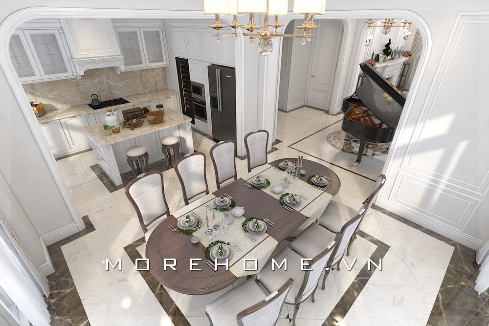 Bố trí nội thất phòng bếp sang trọng ấn tượng với bộ tủ bếp tân cổ điển cao cấp, quý phái.